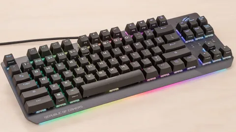 One popular model is the ASUS ROG Stix Scope. This keyboard is designed specifically for gamers, with features like customizable RGB lighting, Cherry MX switches, and a compact design for optimal gameplay. It also offers extra programmable keys and an ergonomic wrist rest for added comfort.
